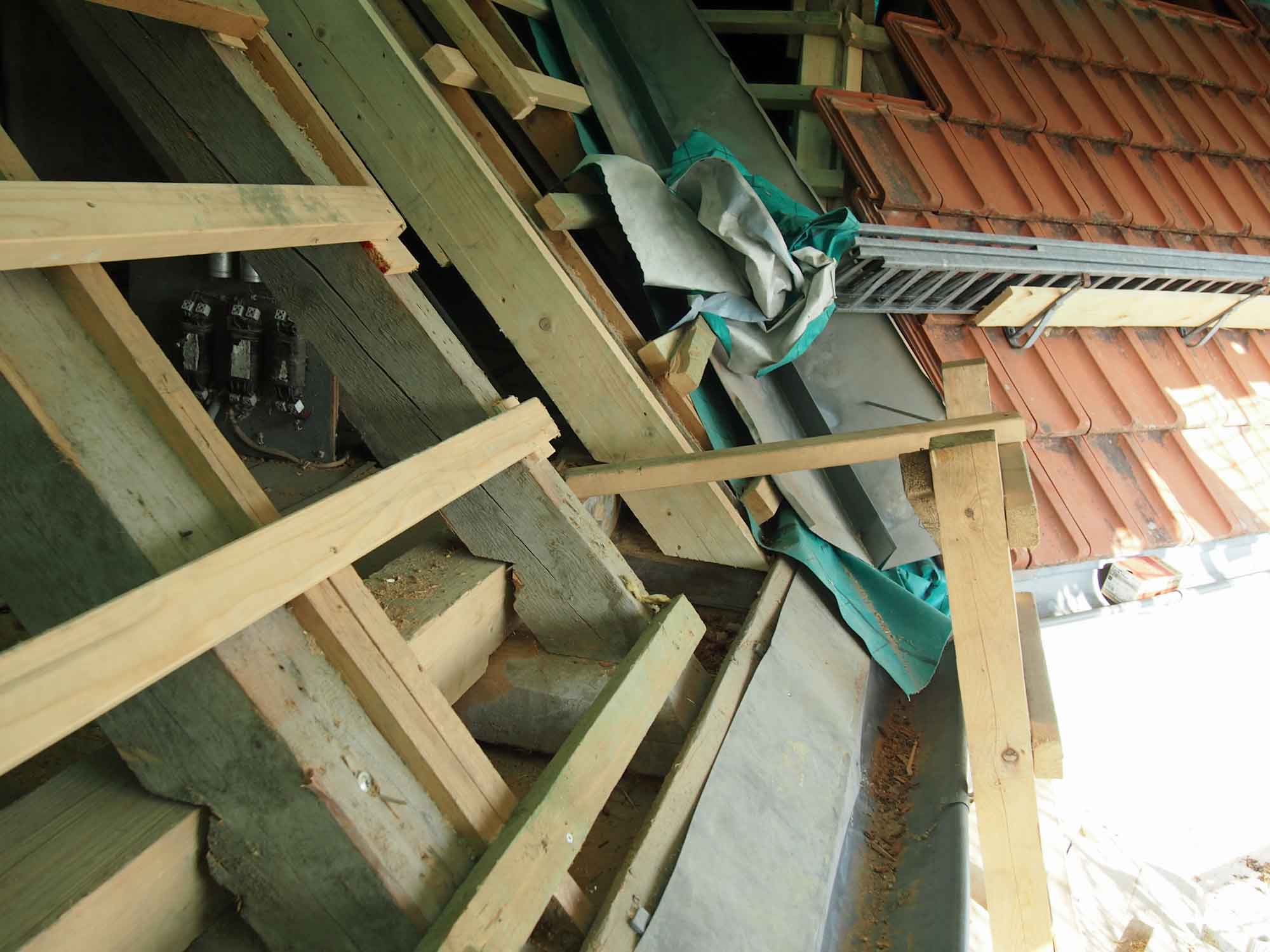 Eigentlich sollten am Dach nur zwei undichte Stellen repariert werden. Nun stellt sich heraus, dass sich über das ganze Dach verteilt kleine und große Schäden finden, vor allem dort, wo die Sparren auf die Fußpfetten treffen. Nach und nach werden nun die betreffenden Stellen für die notwendigen Reparaturen geöffnet.